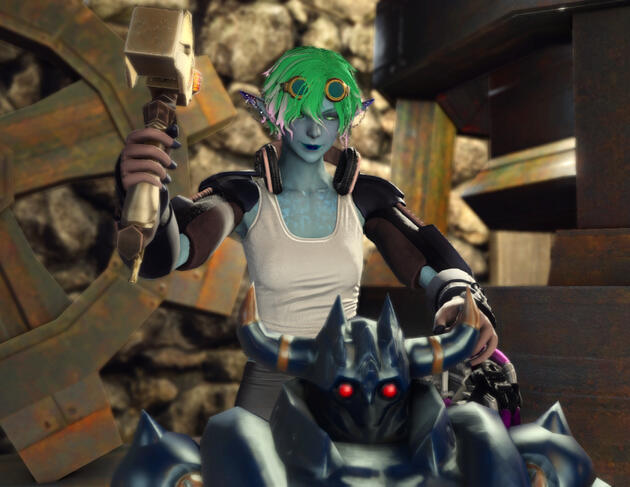 Gum, a merfolk from La Noscea, dedicated their life to discovering and repairing machines found along the sea and coast, spending hours in isolation to study and tinker. Their routine changed dramatically when a draconic diplomat visited their city.Surprisingly, Gum bonded well with the charming dragon boy, who took a keen interest in both Gum and their work. Hailing from a poor family, they lacked the resources for advanced tools or education. Rax, leveraging his position as a diplomat, became the merfolk's patron. This led to Gum traveling the world with the dragon, and, as bonus, gaining a new, overprotective "big sister" in the form of Apoena.With their two new favorite persons by their side, Gum feels ready to face the big world, until they become overwhelmed by interactions, people, and noise. Fortunately, the sea gremlin trusted headphones are always at hand to help them retreat into their own little world when needed.